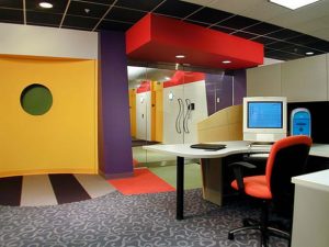 Your employees would feel bored with dull, conventional colors. Make sure that you choose the right color for officeImage that shows the frontview of a room with that a computer placed on the table. interiors and furniture. Go for bright, attractive and warm colors that give a lively look to your office. This would help to provide a trendy and modern look to your office space.